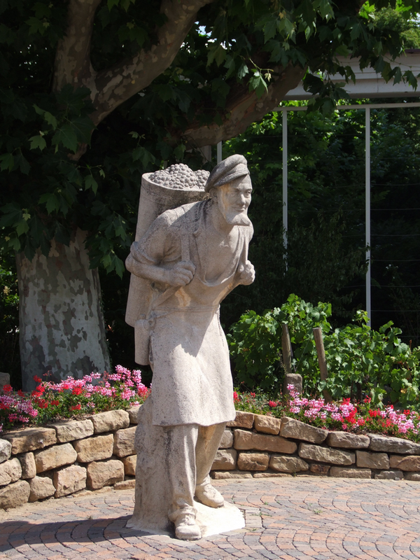 Am Ausgang vom Kurpark zur Kirche und zur Altstadt steht am Ludwigsplatz die nachfolgend sichtbare Figur eines Winzers mit Tragekippe (siehe auch diese Panoramaansicht auf Google-Maps).