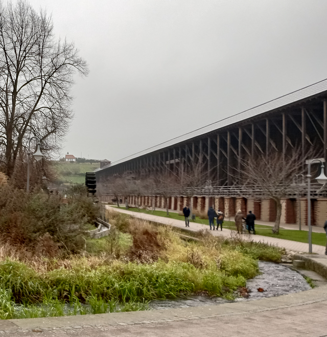 Direkt vom Parkplatz am Fass gelangt man auch zur Saline mit dem in nachfolgendem Foto sichtbaren Gradierwerk. Dort rinnt salzhaltiges Wasser über aufgeschichtetes Weißdornreisig herunter und ermöglicht eine Freiluftinhalation zu Kurzwecken.