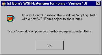 The WSHForm ActiveX control comes AS-IS without any warranty and support. Use the control at your own risk. In no case the author will be liable for damages or losses or whatever else resulting from the use of this component. The OCX module may be freely distributed under the condition that this Programmers Reference is included and that the WSH Bazaar with its URL http://www.borncity.de is mentioned as the source of the control.