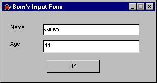 The parameter submitted to the method defines the number of the textbox (1 or 2) whose value shall be returned. The next listing shows how to invoke the form and queries a name and an age.