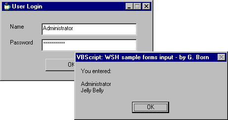 This reference describes the Form1 object model of the WSHForms ActiveX control. WSHForms is an ActiveX control which provides a simple form and an about dialog for WSH script. The foundation of this control was discussed within my book Windows Script Host Tutorial. Within this book I have shown how to use forms with buttons, text boxes, list boxes and more within WSH scripts. But this requires also that a script programmer deals with the form's source code - a task not always welcome to many programmer. I saw many requests for a simple login dialog retrieving a user name and a password. Therefore I have modified the control in a manner that a script programmer can use it without accessing the source code to display a predefined form. The OCX file (see below) and this reference are released to the public in the internet. The source code of the original control and many samples may be found in my Windows Scripting Host Tutorial.